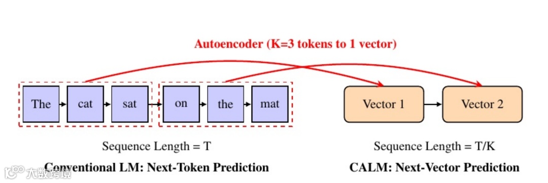 CALM实现了从离散的下一个标记预测到连续的下一个向量预测的范式转变: