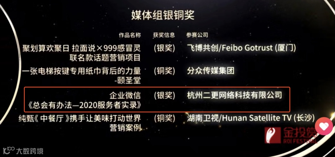 2020年10月22日,第十三届金投赏国际创意节颁奖典礼圆满落幕。视然·二更与企业微信共同打造的《总会有办法—2020服务者实录》在784件入围作品中脱颖而出,斩获商业创意奖·媒体组视频-内容营销银奖。