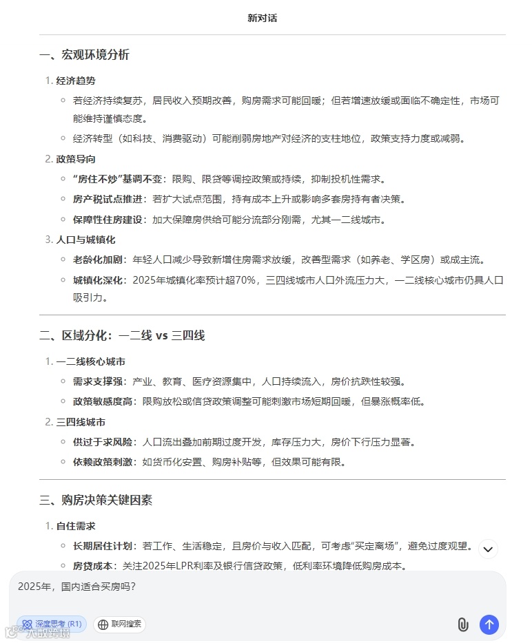 DeepSeek给的答案是:2025年是否适合买房,取决于城市能级、个人需求及风险承受能力。