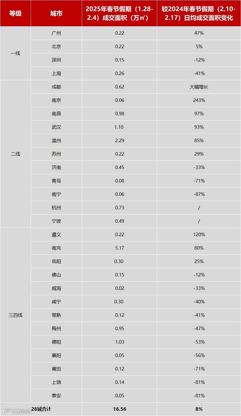 从网签整体表现来看,中指研究院的最新数据显示,春节假期期间(1月28日—2月4日)28个代表城市新房日均成交面积较去年假期(2月10日—2月17日)增长8%。