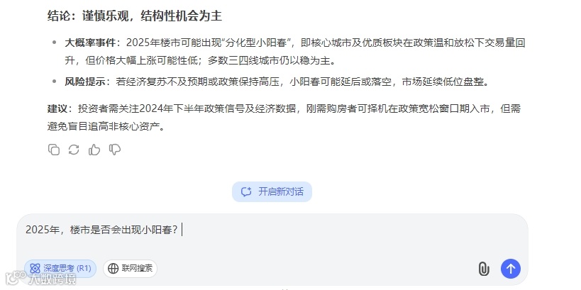 DeepSeek给出的建议分析是:对于2025年中国楼市是否会出现“小阳春”,需综合政策、经济、人口、供需等多重因素分析。