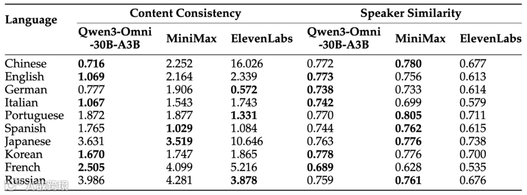 在支持10种语言的多语言语音生成评估中,相比MiniMax-Speech和ElevenLabs Multilingual v2模型,在中文、英文和法语等语言上大幅超越这些模型,在其余语言上提供有竞争力的结果(如表11所示)。