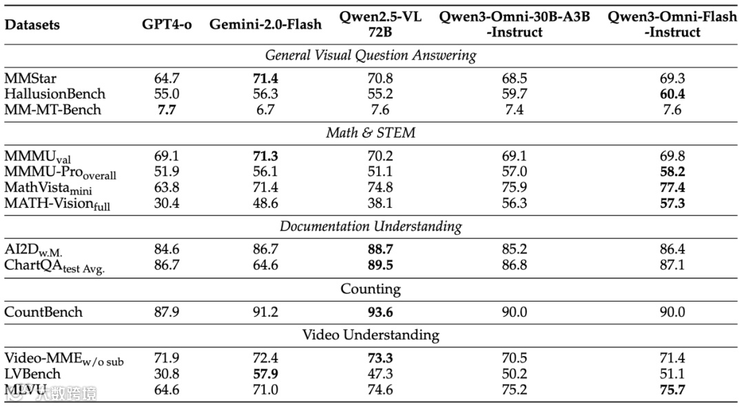 表6:Qwen3-Omni-Instruct与其他非推理基线的视觉到文本性能