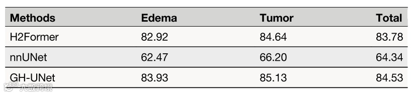在私人数据集上,GH-UNet的总体Dice系数(肿瘤核心+水肿区域)为84.53%,分别比HFormer(83.78%)和nnUNet(64.34%)高0.75%和20.19%。