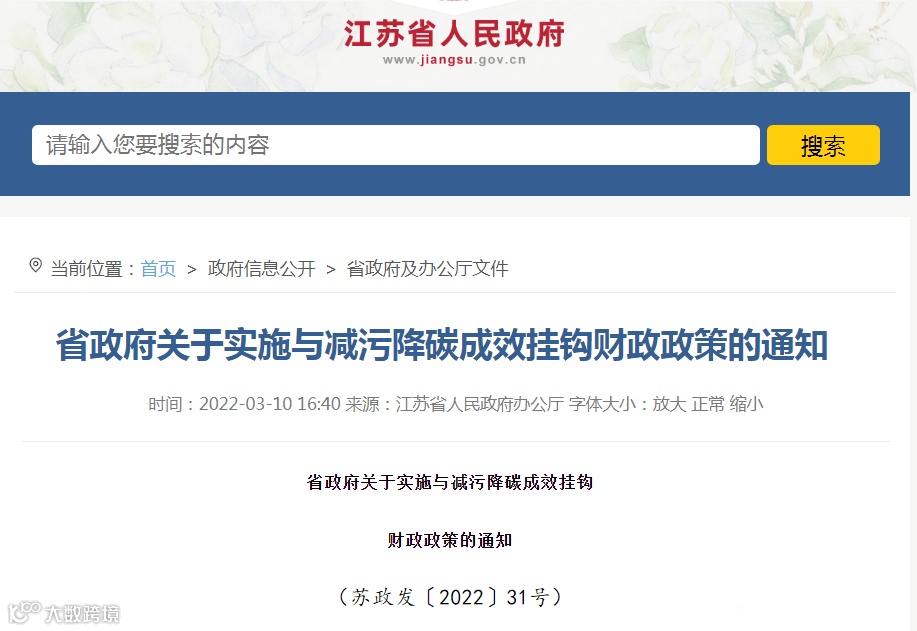 一、江苏省实施与减污降碳成效挂钩财政政策(2022年3月10日)