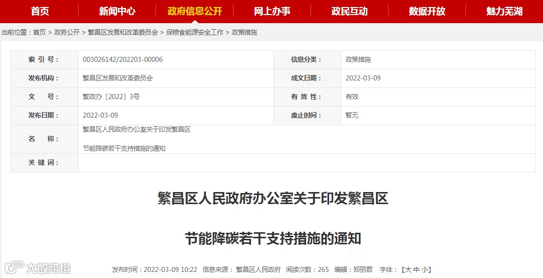二、安徽芜湖繁昌区出台节能降碳若干支持措施:主动关闭高耗能企业最高可获800万元补助(2022年3月9日)