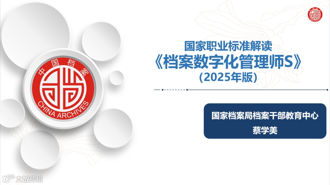 在档案事业发展面临全面数字化转型,档案工作从手工管理迈向信息化管理的时代背景下,2025年3月24日,人力资源社会保障部与国家档案局联合颁布了国家职业标准《档案数字化管理师S》(2025年版)。课程全面介绍档案行业第一个国家职业标准《档案数字化管理师S》(2025年版)编制出台的背景、过程,编制的政策和工作依据。标准的主要内容,学习贯彻标准应该注意的关键点,标准出台后对档案行业的影响和意义。