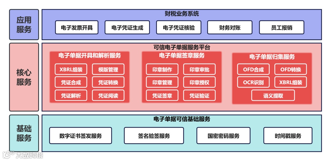基于OFD版式软件技术,按照“基础服务-核心服务-应用服务”三层业务体系,各层级紧密协作、深度融合,为客户构建从电子单据开具、财务核销到归档的全链路数字化能力, 为财税管理数智化转型提供坚实支撑。