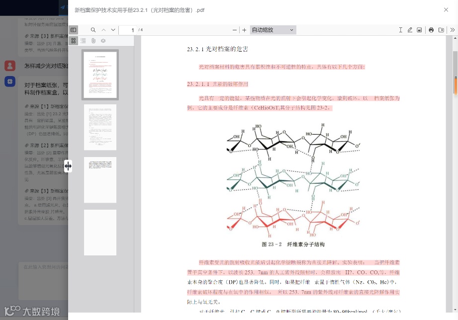 系统在提供问题答案的同时,可精确定位至《新档案保护与利用技术实用手册》等文献的具体章节,通过红色高亮标注原文内容,确保技术依据的可验证性。
