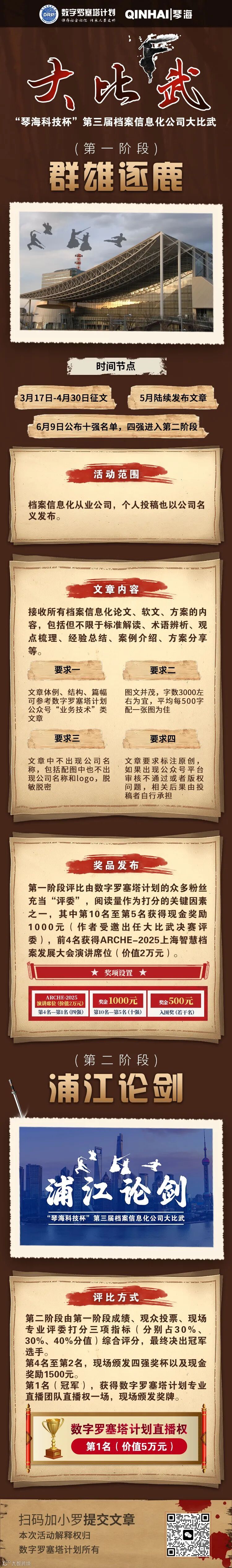 第三届大比武活动得到了琴海科技股份有限公司的大力支持,因此冠名为“琴海科技杯”。本次活动第二阶段将在“第四届上海智慧档案展览会暨智慧档案发展大会”上进行,有关ARCHE-2025的详细介绍参见本号文章《【ARCHE-2025】加强智慧档案建设,落实电子档案管理》。