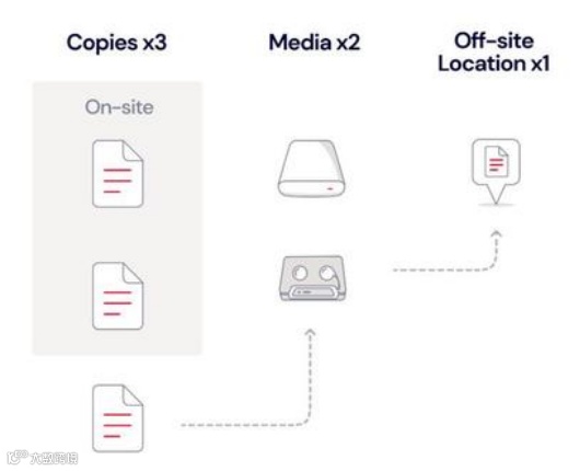 在数据存储备份领域,“3-2-1”备份策略早已为大家所熟知,“3-2-1”备份策略可以简单归纳为:对于需要长期存储的数据,至少要有3份拷贝(副本),它们被存储在2种不同的物理载体上,其中1份必须是可移动的,离线的永久拷贝。“3-2-1”备份策略有效消除了数据存储出现单点故障的风险,不仅在一个副本损坏或技术失败的情况下为组织提供保障,而且在发生自然灾害或盗窃导致物理存储类型消失的情况下也得到保障。