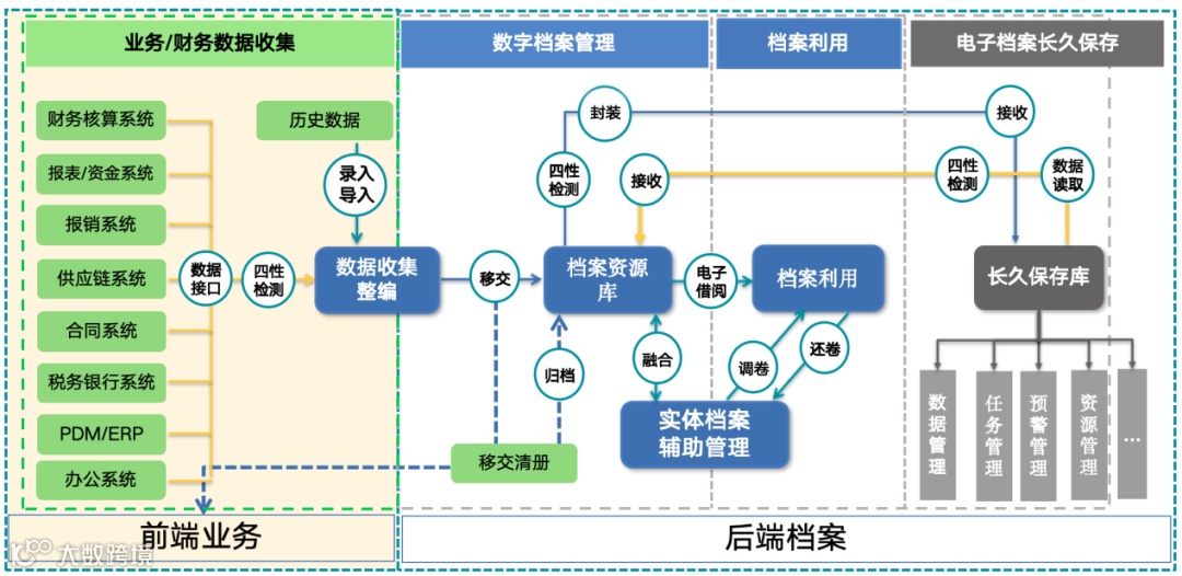 集团企业前端业务系统众多,需要把业务、财务系统中产生的数据归档到档案系统中,如下图: