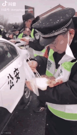 没有座位,餐桌是警车的前车盖,雪花纷纷扬扬飘进盒饭里,看着都凉。