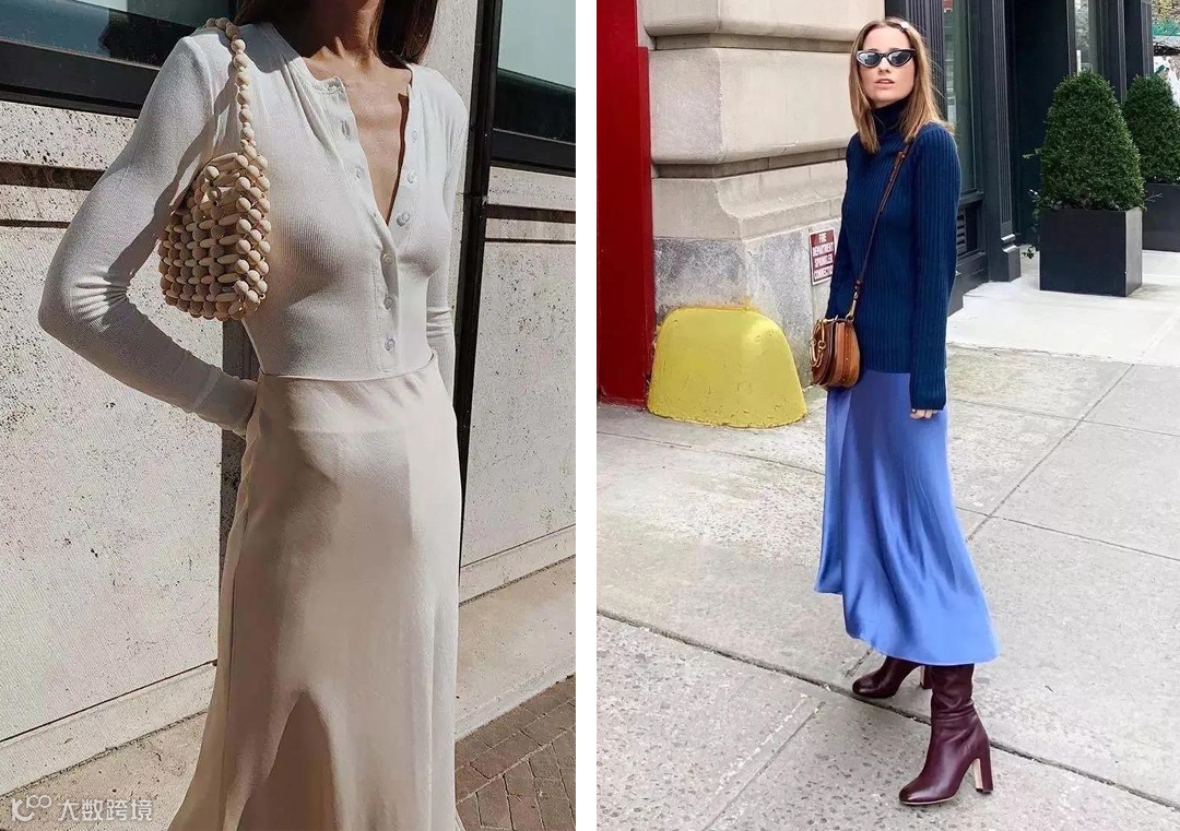 柔软的针织+缎面裙,温柔一刀最致命。选同色系搭配不会出错,而且看起来很“贵”, 又欲又纯,优雅又气质。