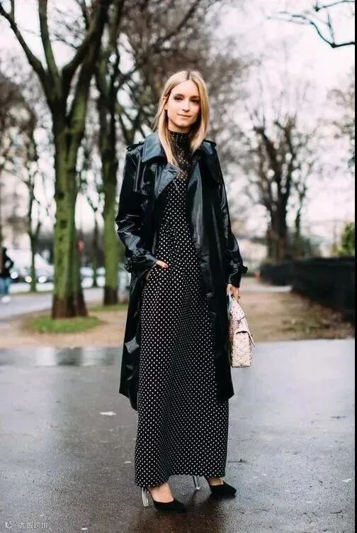 风衣+连衣裙,如果外套本身设计感较强,那就可以用素雅的裙子做内搭。