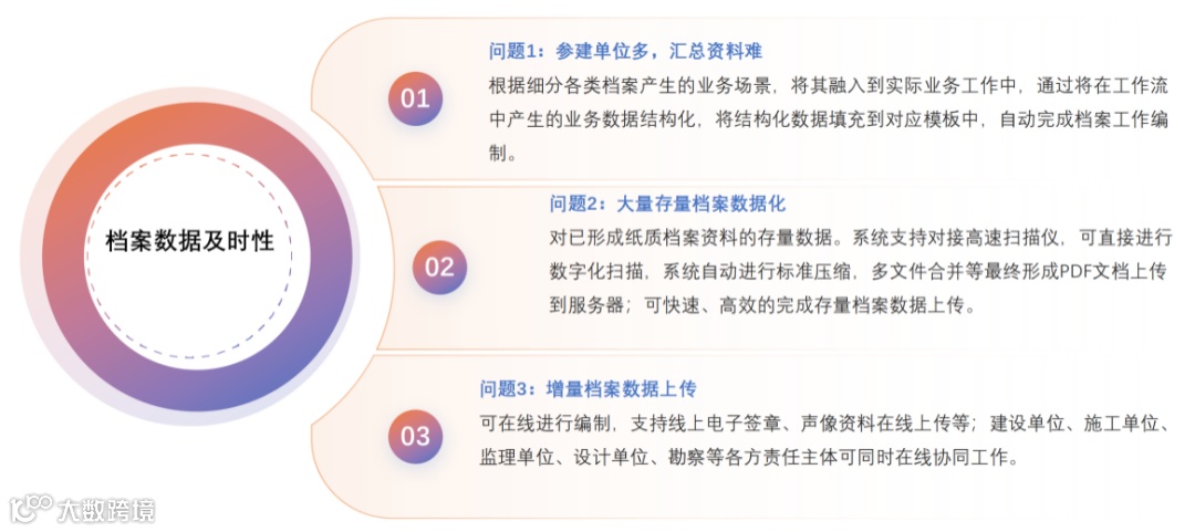 工程项目建设参与主体众多,各主体档案资料编制方式、数据标准、验收归档等要求不一,降低各方工作效率;