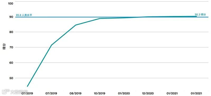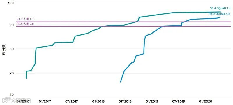 SQuAD 1.1的F1成绩从2016年8月的67.75分提高到了2018年9月的91.22分(25个月),而SQuAD 2.0仅用了10个月的时间就超过了人类的表现(从2018年5月的66.3分提高到2019年3月的89.47分)。2020年,最先进的SQuAD 1.1和SQuAD 2.0的F1成绩分别达到了95.38分和93.01分。