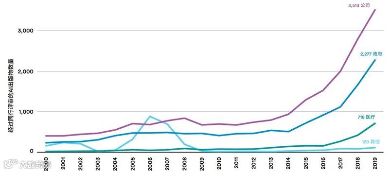 ▲2000-19年按机构隶属关系展示的美国经同行评审的AI出版物数量