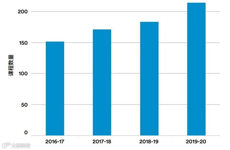 在过去四个学年中,教授学生建立或部署实用人工智能模型所需技能的研究生课程增加了41.7%,从2016-17学年的151门课程增加到了2019-20学年的214门课程。