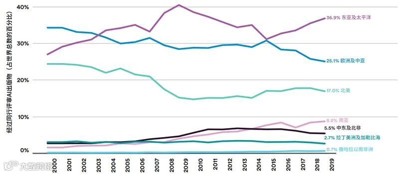 ▲ 2000-19年按地理区域展示的同行评审的AI出版物(占总数的百分比%)