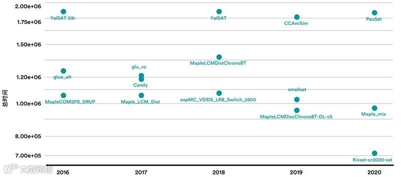 ▲2016-20年每个解算器解算全部400个实例的总时间及年份(越低越好)