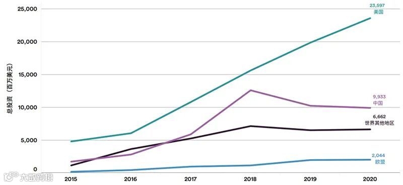 仔细研究美国、中国和欧盟这三个主导人工智能竞赛的竞争者,可以进一步验证美国在人工智能私人投资方面的主导地位。虽然中国在2018年的人工智能私人投资额异常高,但其在2020年的投资水平还不到美国的一半。