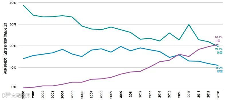 ▲ 2000-20年按地区分列的AI期刊出版文献(占全球总数的百分比 %)