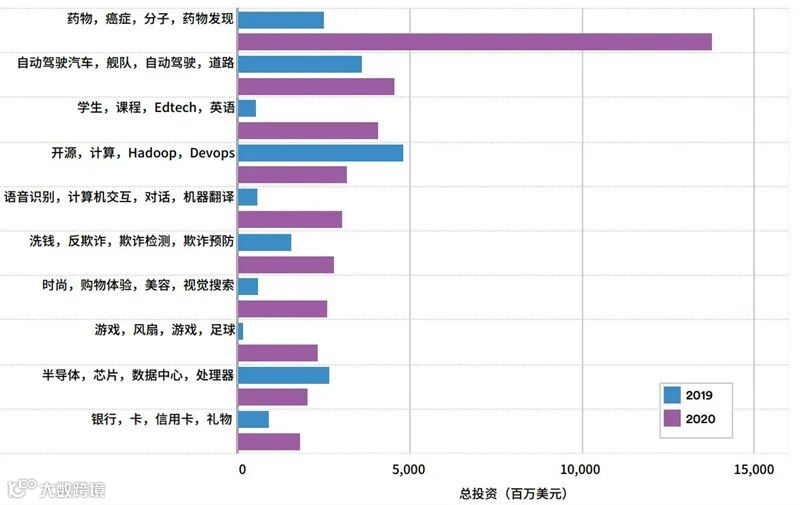 ▲ 2019年vs 2020年按重点领域划分的全球AI私人投资