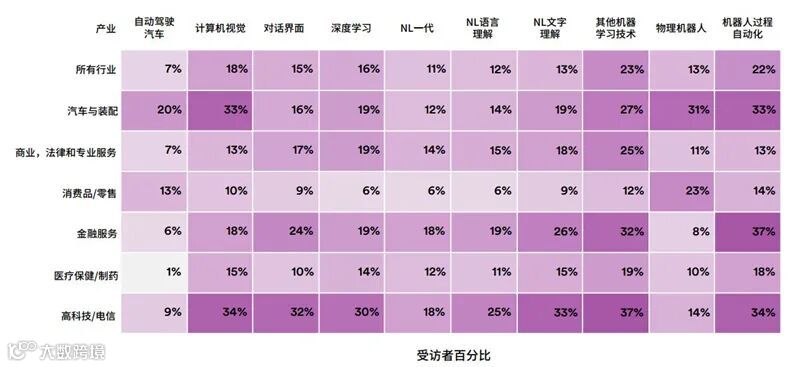 2020年,报告应用人工智能的情况最多的是代表高科技和电信企业的受访者,这与2019年的结果是相似的。其次是金融服务和汽车及装配业。