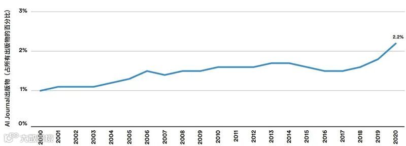 ▲2000-20年AI期刊出版文献(占所有期刊出版文献的百分比 %)
