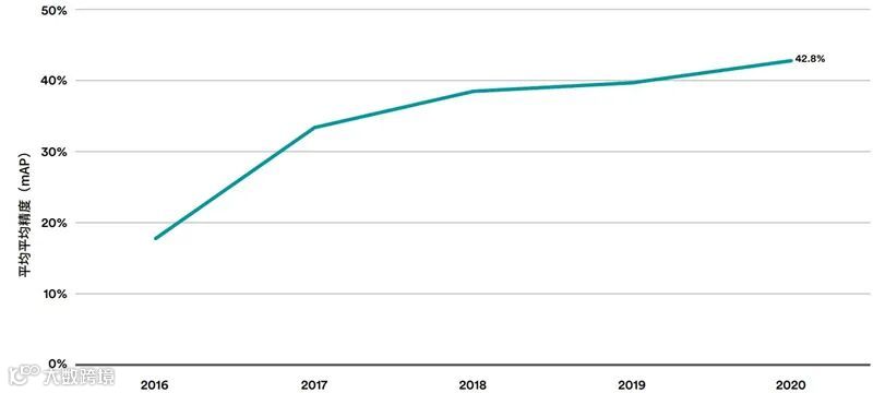 Top-5准确度考察的是正确的标签是否出现在分类器的前五个预测中。错误率已从2013年的85%左右提高到2020年的99%左右。