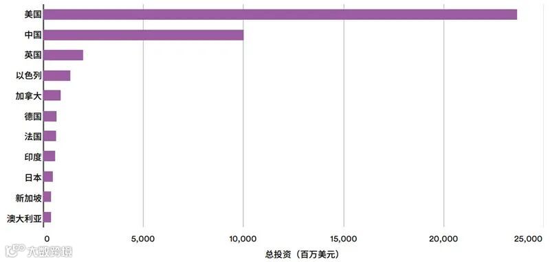 如下图所示,美国仍然是私人投资的主要流向地,2020年的私人投资金额超过了236亿美元。其次是中国(99亿美元)和英国(19亿美元)。