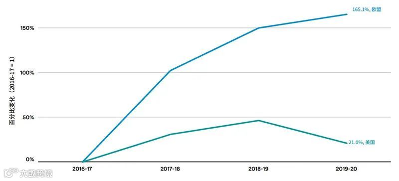 2019-20学年,入门级人工智能和机器学习课程的招生人数略有下降,这主要是由于美国大学课程数量的减少所造成的。在过去的四个学年中,欧盟的入门级课程注册人数增加了165%,而美国的此类注册人数在上一个学年出现了明显的下降。