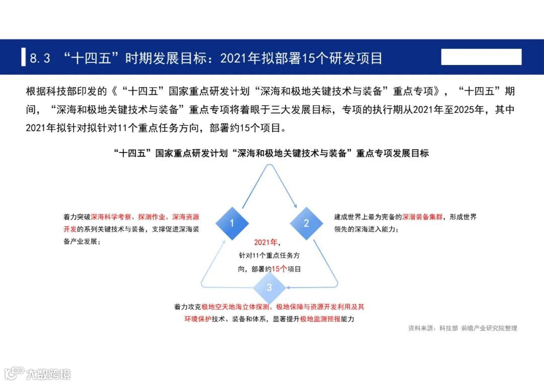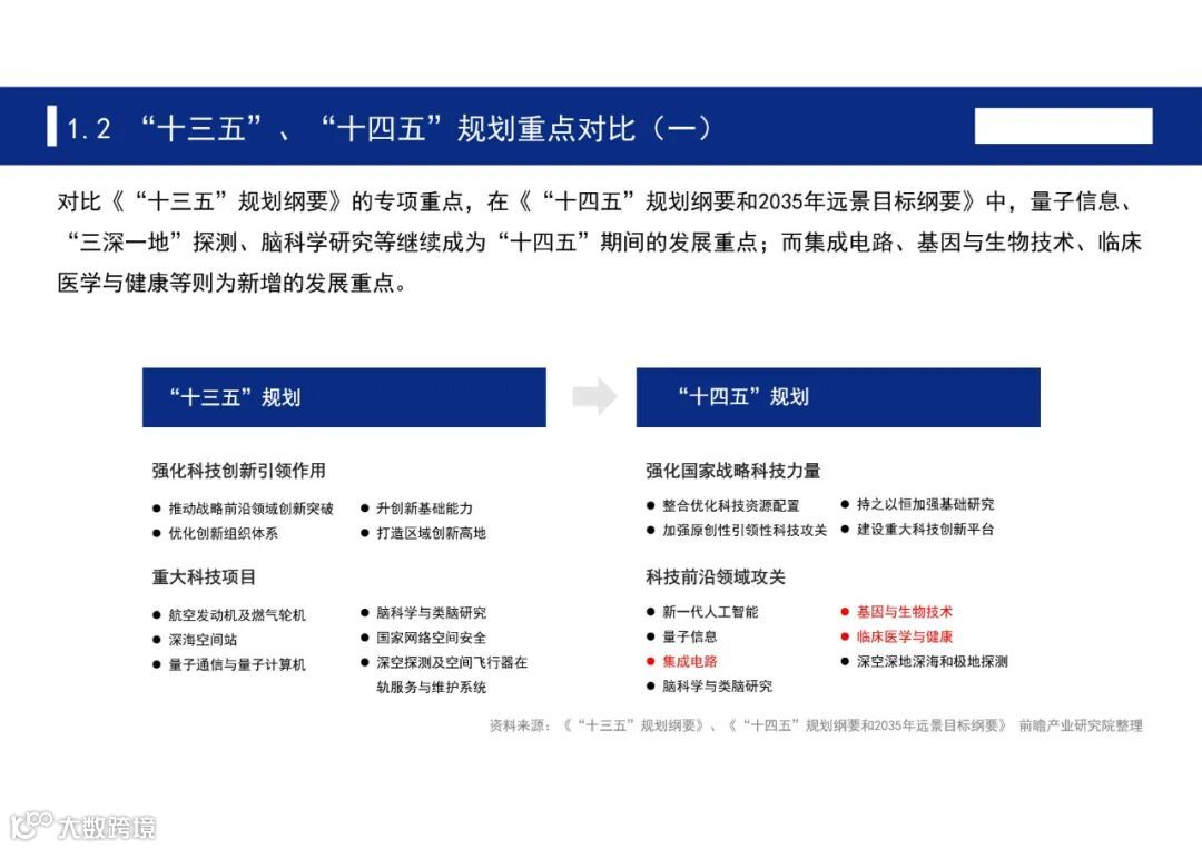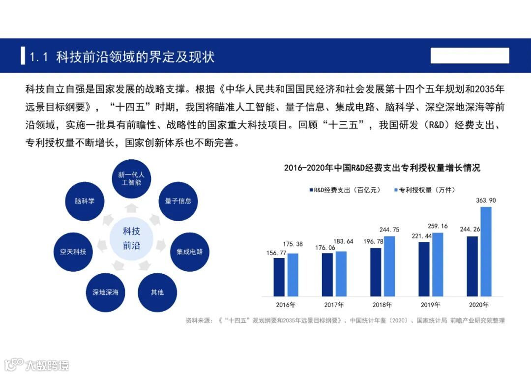 根据《中华人民共和国国民经济和社会发展第十四个五年规划和2035年远景目标纲要》,“十四五”时期,我国将瞄准人工智能、量子信息、集成电路、脑科学、深空深地深海等前沿领域,实施一批具有前瞻性、战略性的国家重大科技项目。为此,前瞻产业研究院发布《聚焦十四五:中国七大科技前沿领域十四五发展全景前瞻》,对七大科技前沿领域十四五发展全景进行深度解析。
