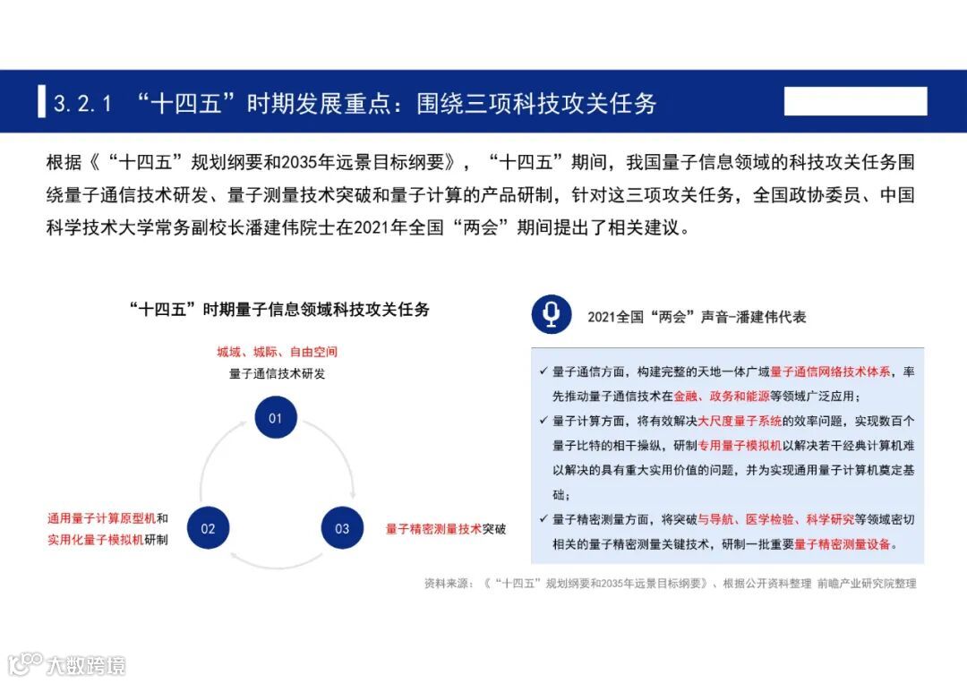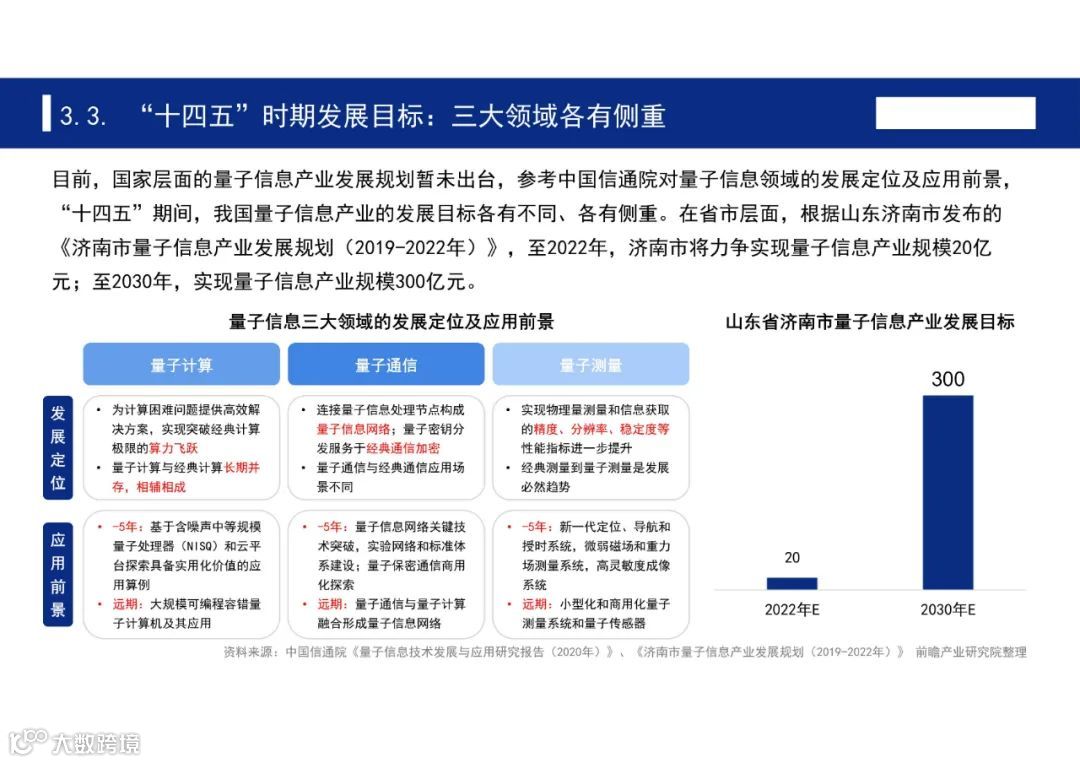 目前,国家层面的量子信息产业发展规划暂未出台,参考中国信通院对量子信息领域的发展定位及应用前景,“十四五”期间,我国量子信息产业的发展目标各有不同、各有侧重。