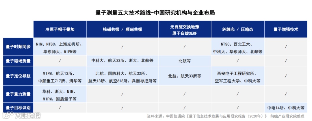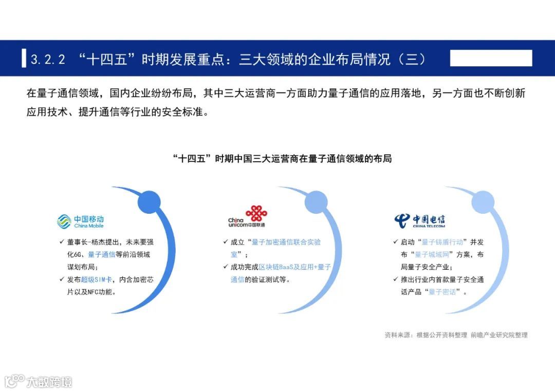 研究机构和企业的布局也表明了“十四五”量子信息产业的发展方向。根据中国信通院公布的《量子信息技术发展与应用研究报告(2020年)》,在量子测量领域,以五大技术路线为发展主线,这五大技术包括基于冷原子相干叠加,基于核磁共振或顺磁共振等。在量子计算领域,我国科技巨头阿里巴巴、腾讯、百度和华为通过与科研机构合作等方式成立量子实验室,布局量子处理器硬件、量子计算云平台等领域;而初创公司-本源量子,则在量子处理器硬件、开源软件平台和量子计算云服务等方面进行探索。在量子通信领域,国内企业纷纷布局,其中三大运营商一方面助力量子通信的应用落地,另一方面也不断创新应用技术、提升通信等行业的安全标准。