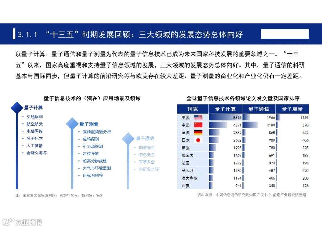“十三五”以来,国家高度重视和支持量子信息领域的发展,三大领域的发展态势总体向好。其中,量子通信的科研基本与国际同步,但量子计算的前沿研究等与欧美存在较大差距、量子测量的商业化和产业化仍有一定差距。根据《“十四五”规划纲要和2035年远景目标纲要》,“十四五”期间,我国量子信息领域的科技攻关任务围绕量子通信技术研发、量子测量技术突破和量子计算的产品研制。
