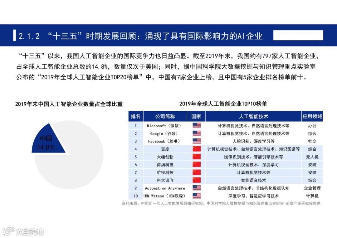 报告显示,“十三五”以来,我国人工智能企业的国际竞争力也日益凸显。截至2019年末,我国约有797家人工智能企业,占全球人工智能企业总数的14.8%,数量仅次于美国;同时,据中国科学院大数据挖掘与知识管理重点实验室公布的“2019年全球人工智能企业TOP20榜单”中,中国有7家企业上榜,且中国有5家企业排名榜单前十。