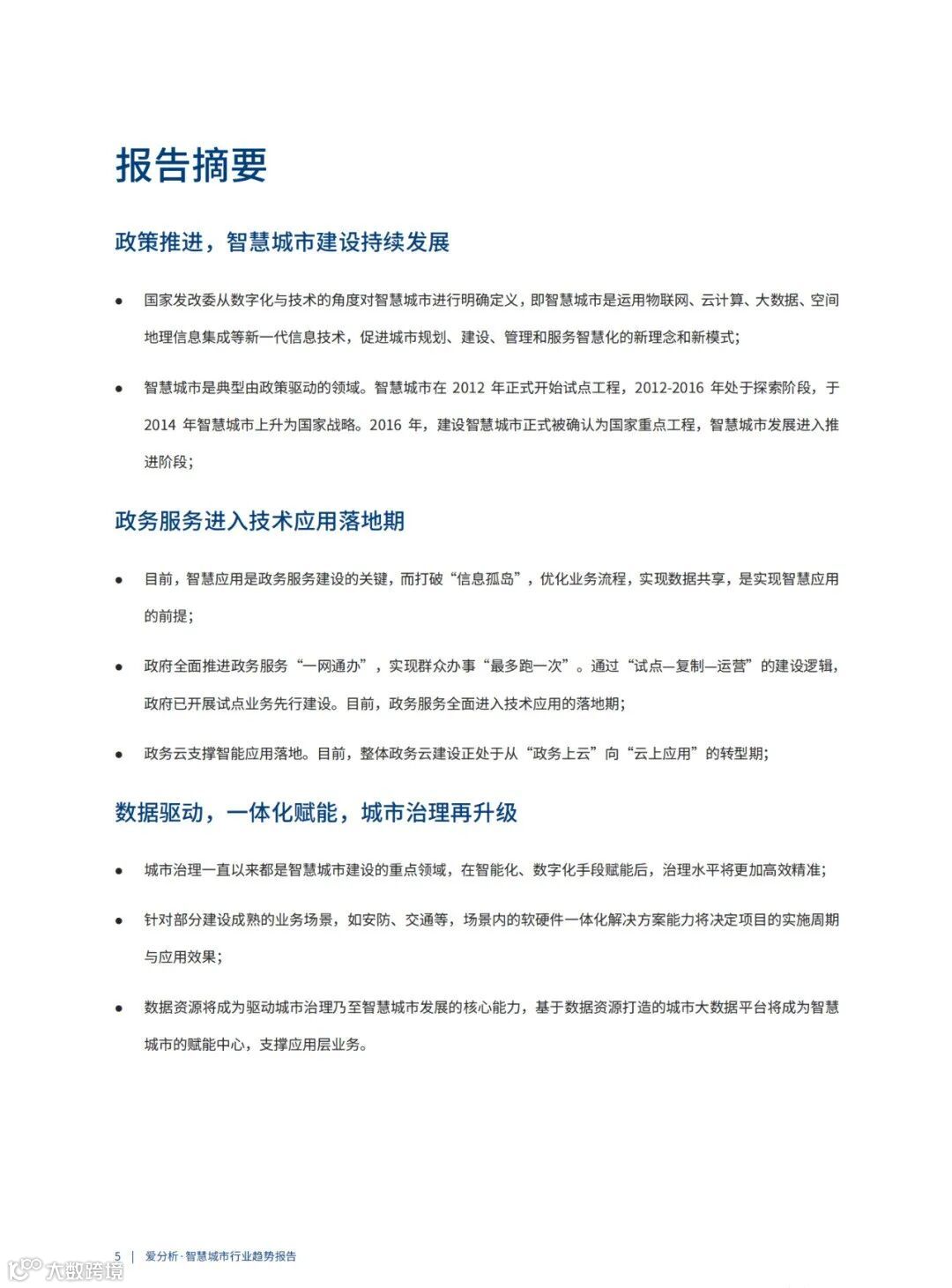 ●数据资源将成为驱动城市治理乃至智慧城市发展的核心能力,基于数据资源打造的城市大数据平台将成为智慧城市的赋能中心,支撑应用层业务。