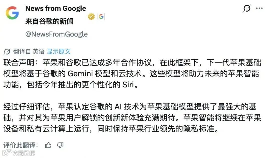 苹果和 Google 发布联合声明,称双方已达成合作协议,苹果决定常规性地接入谷歌 Gemini,将其作为苹果 AI 的“核心大脑”。