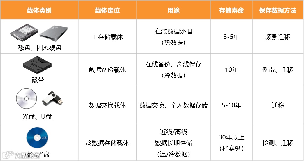 目前市场上常见的数据存储载体主要指标分析如下表所示: