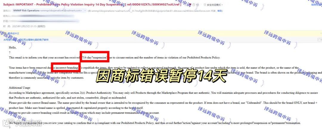 客户与我们联系后,我们仔细查看了沃尔玛官方发送的暂停通知邮件全文:发现客户的店铺因商标问题被暂停7/14天。