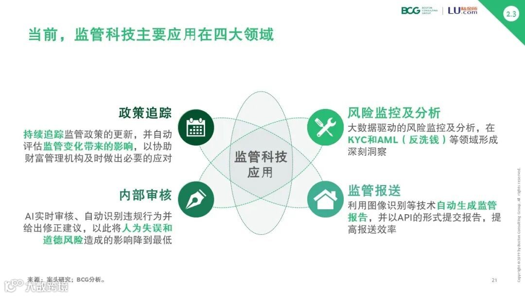 建议监管机构开放思路,拥抱数据与科技。数据与科技应用的提速,让监管所面对的市场复杂度和创新模式都在呈几何级增加。智能化时代的来临是必然趋势,需要有一个高瞻远瞩、适变应变的监管体系。这意味着:一,监管定位要从被动监督升级到主动引领,在管理创新风险的同时也要为创新培育沃土;二,设立沙盒机制,在风险可控的情况下鼓励创新技术的发展与快速迭代;三,从监督规则到监督数据,以适应新的模式与业态、降低对创新的监管不确定性并降低机构合规成本;四,保持对创新技术的敏锐度,大力发展监管科技,用技术管理技术,打造专业、高效和精准的智慧监管体系。