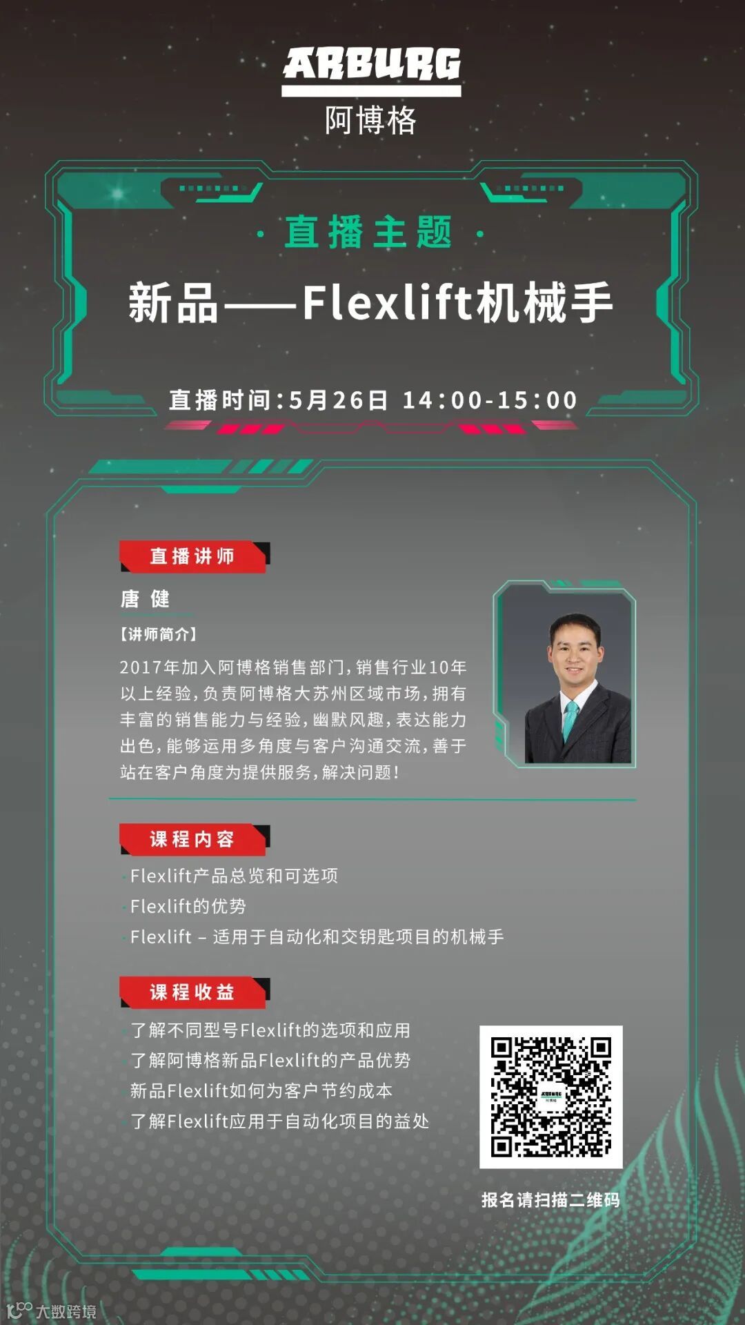 阿博格销售专家唐健(Adam Tang)于2023年5月26日,将系统性为大家介绍阿博格新品Flexlift的特点与优势,能为广大客户带来的收益欢迎大家围观哦!