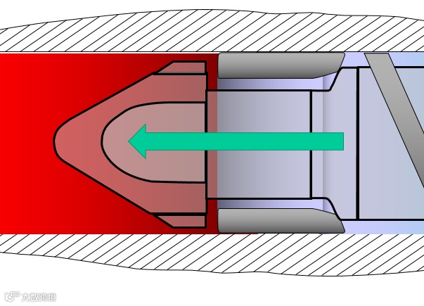 熔融材料推动止逆环往螺杆火箭头方向运动,同时经过止逆环与止逆环底座的间隙(图示绿色箭头),以及螺杆火箭头的间隙,进入炮筒前段;