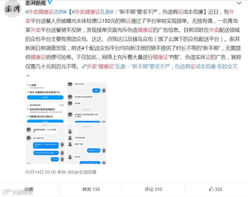 近日,有媒体曝光了外卖平台送餐人员未体检便以150元的假证通过了平台审核实现接单。