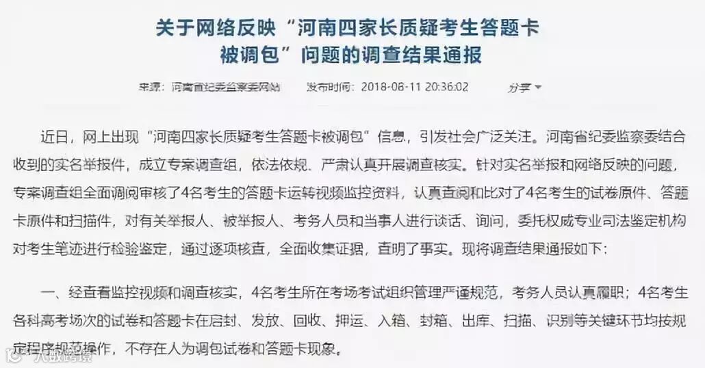 “经调查答题卡运转监控录像,与权威专家笔迹鉴定,并不存在人为掉包事件。”