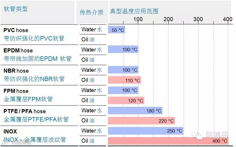 图中可以看到很多不同的软管,事实上,不同的软管有不同的适用范围: