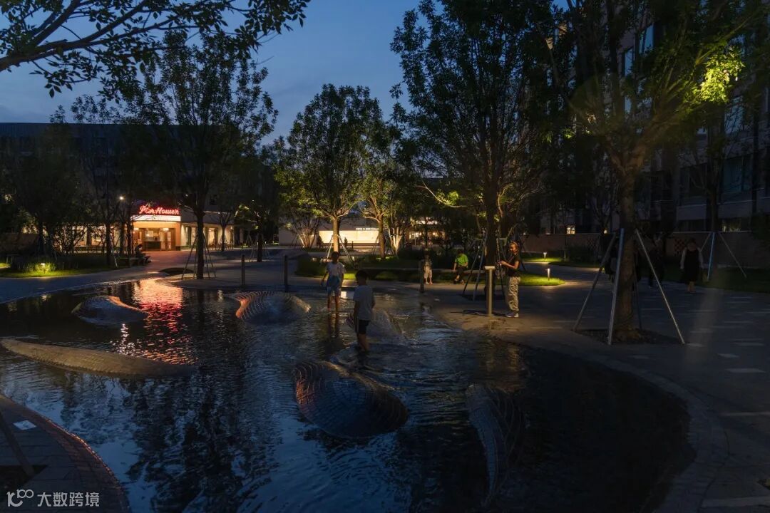 景观的时间性与路径体验:随着日光渐盛,这片景致也变成充满活力、公共开放的嬉水乐园;当夜幕降临,临街店铺华灯初上,点点灯火倒映在水中,水系也成为凝聚商业活力的场所。