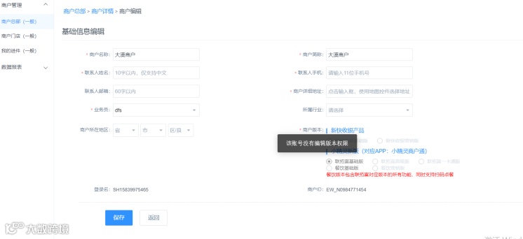若不勾选这个权限 就只能新增基础版的商户/门店